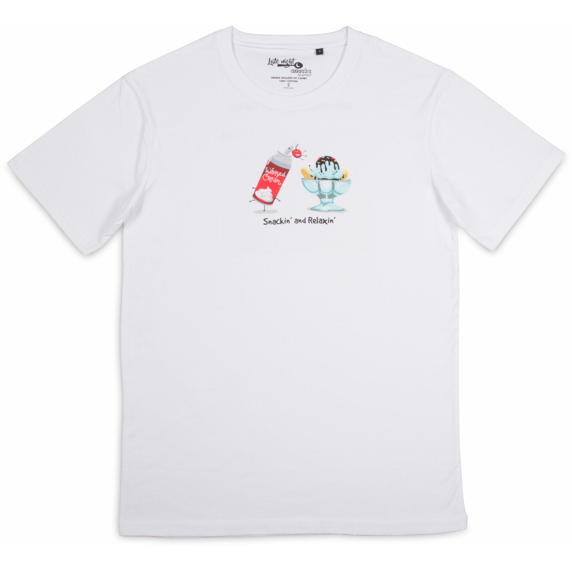 - IN-HOUSE DESIGN: "Snackin' And Relaxin'" text is printed on the front of the t-shirt, alongside the printed ice-cream and whipped cream icons. "Eat. Sleep. Snack. Repeat." text is printed on the back of the t-shirt.
