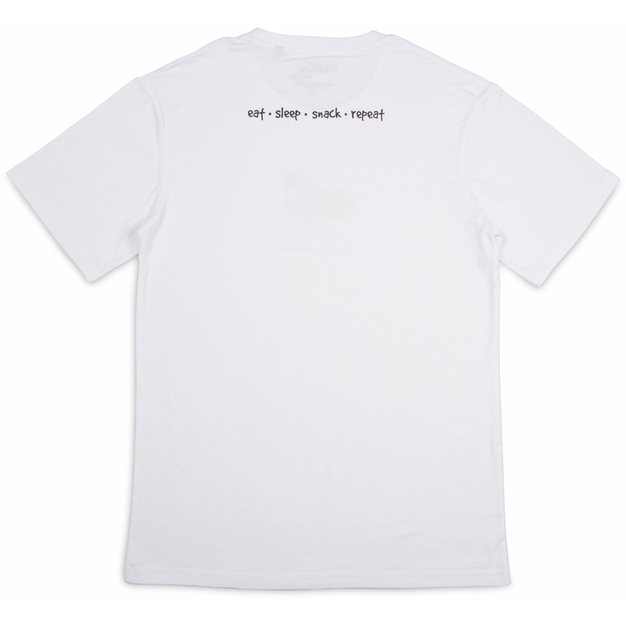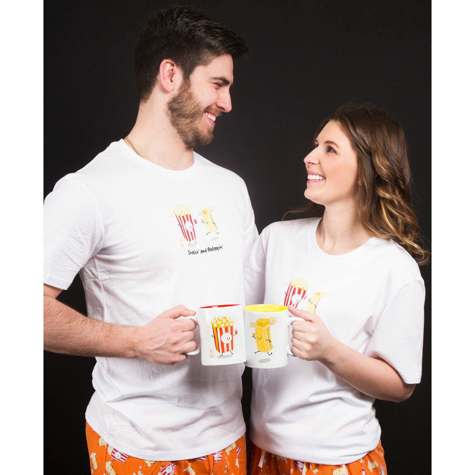 - IN-HOUSE DESIGN: "Snackin' And Relaxin'" text is printed on the front of the t-shirt, alongside the printed popcorn and butter icons. "Eat. Sleep. Snack. Repeat." text is printed on the back of the t-shirt.