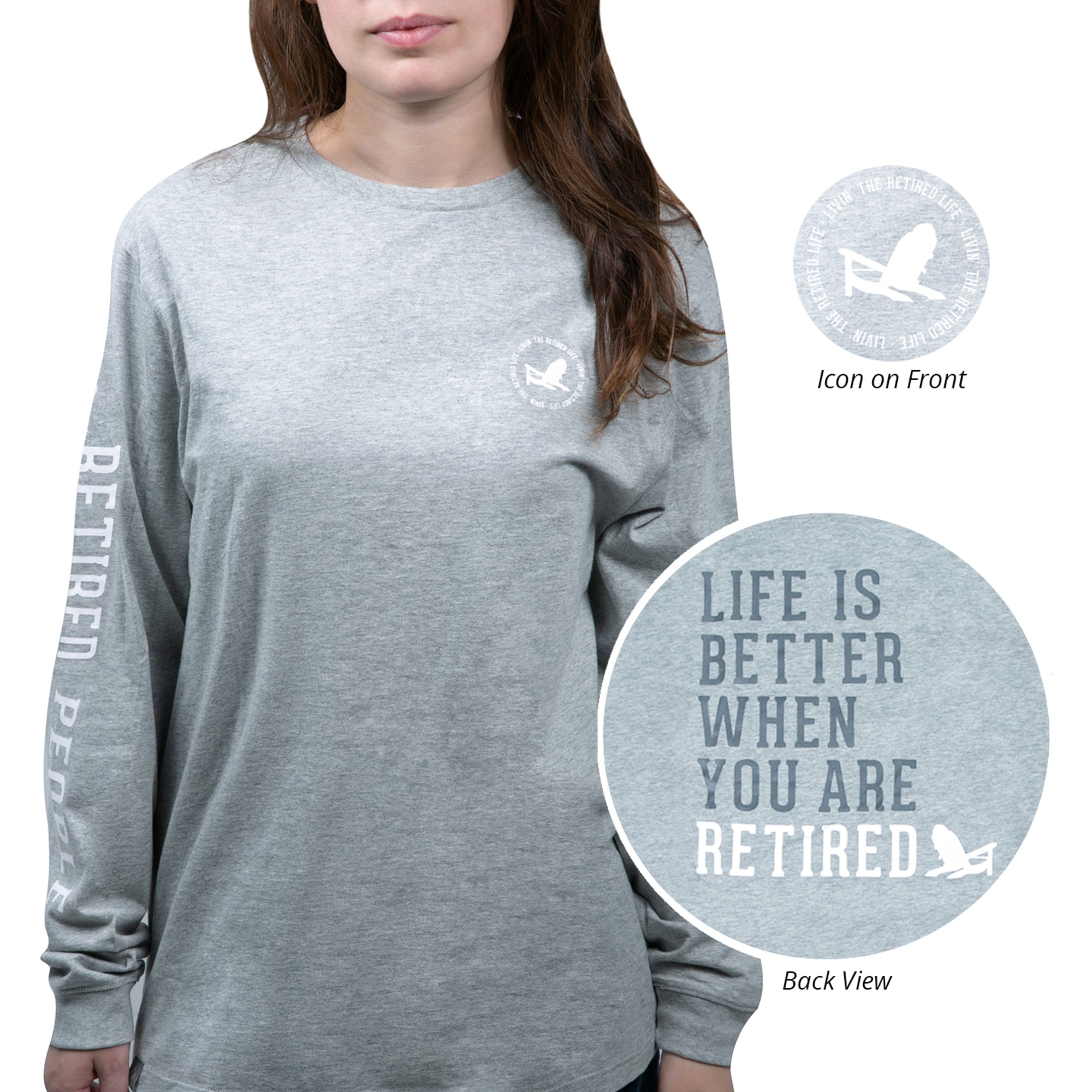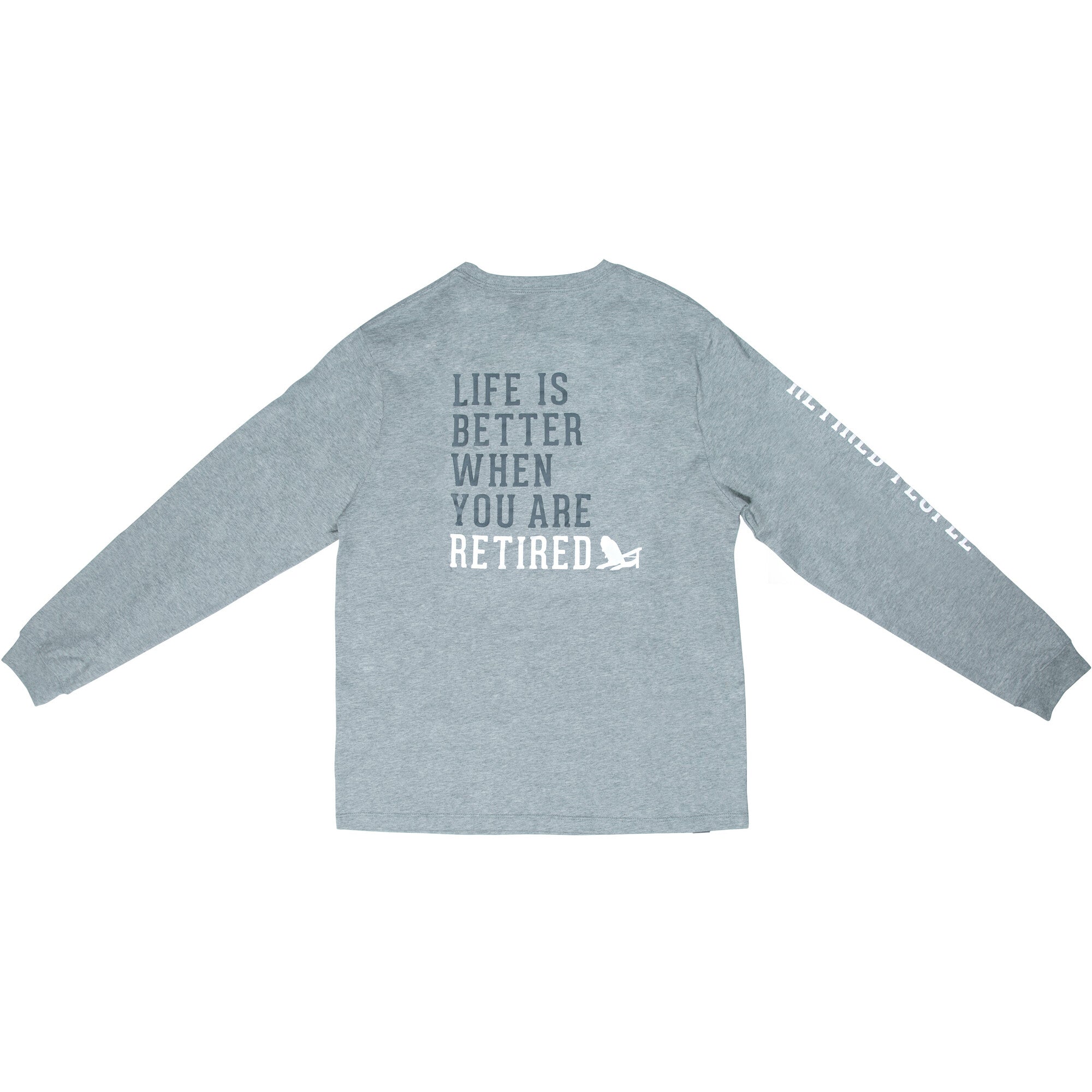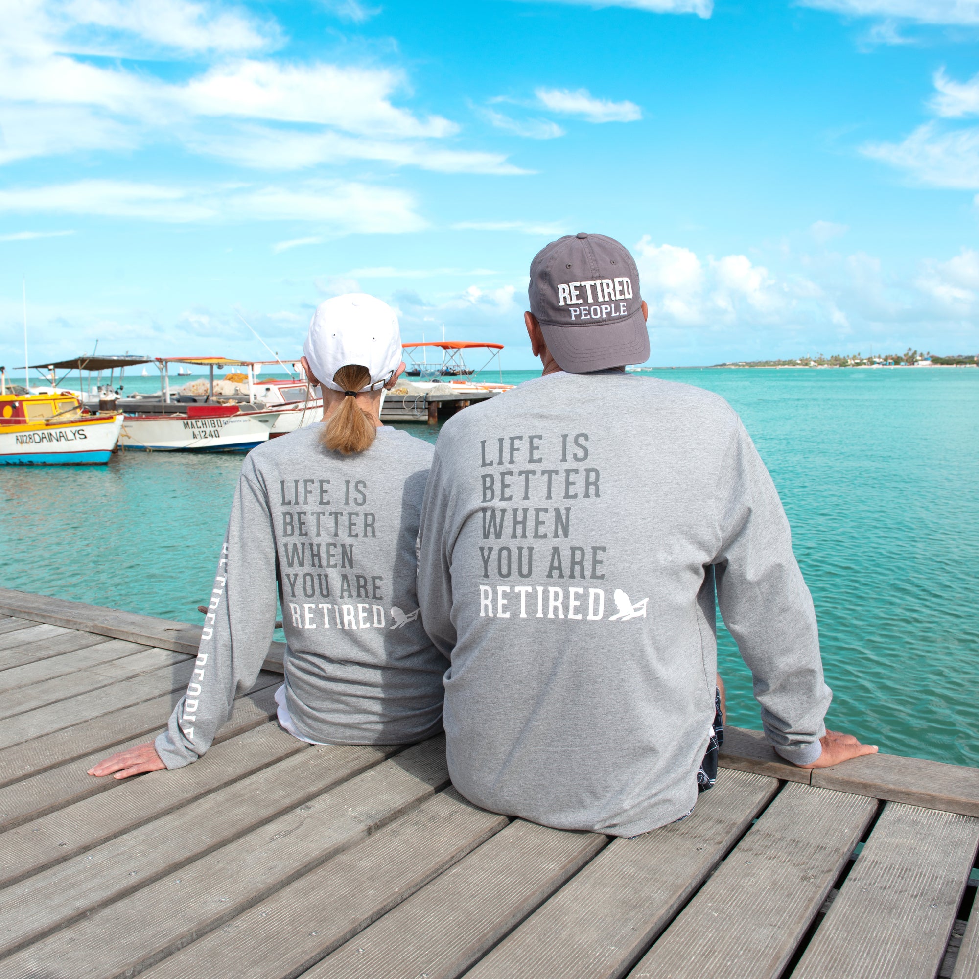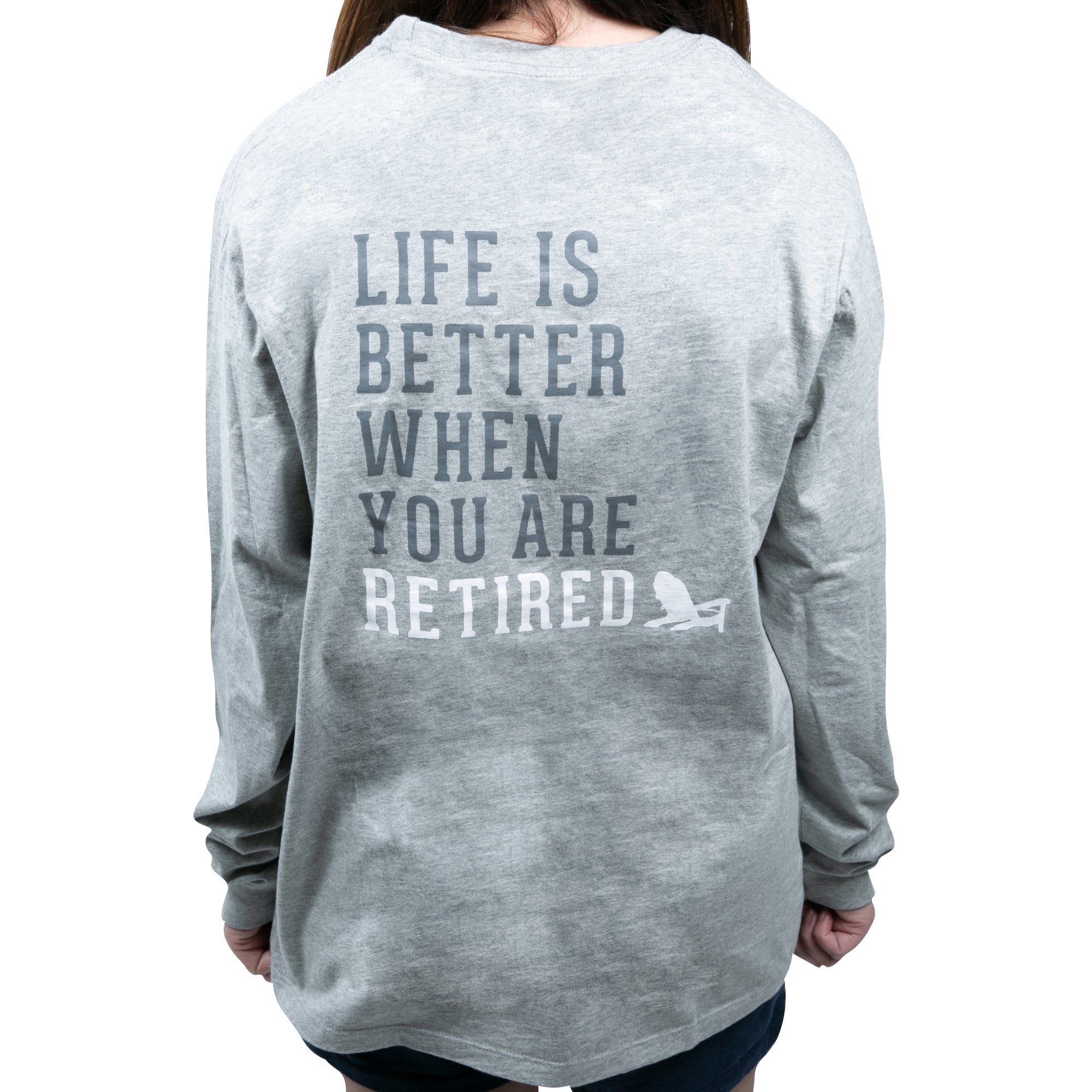 - IN-HOUSE DESIGN: Deck chair icon on the front, "Retired People" text on the arm and "Life Is Better When You Are Retired" text on the back are all screen-printed onto the shirt.