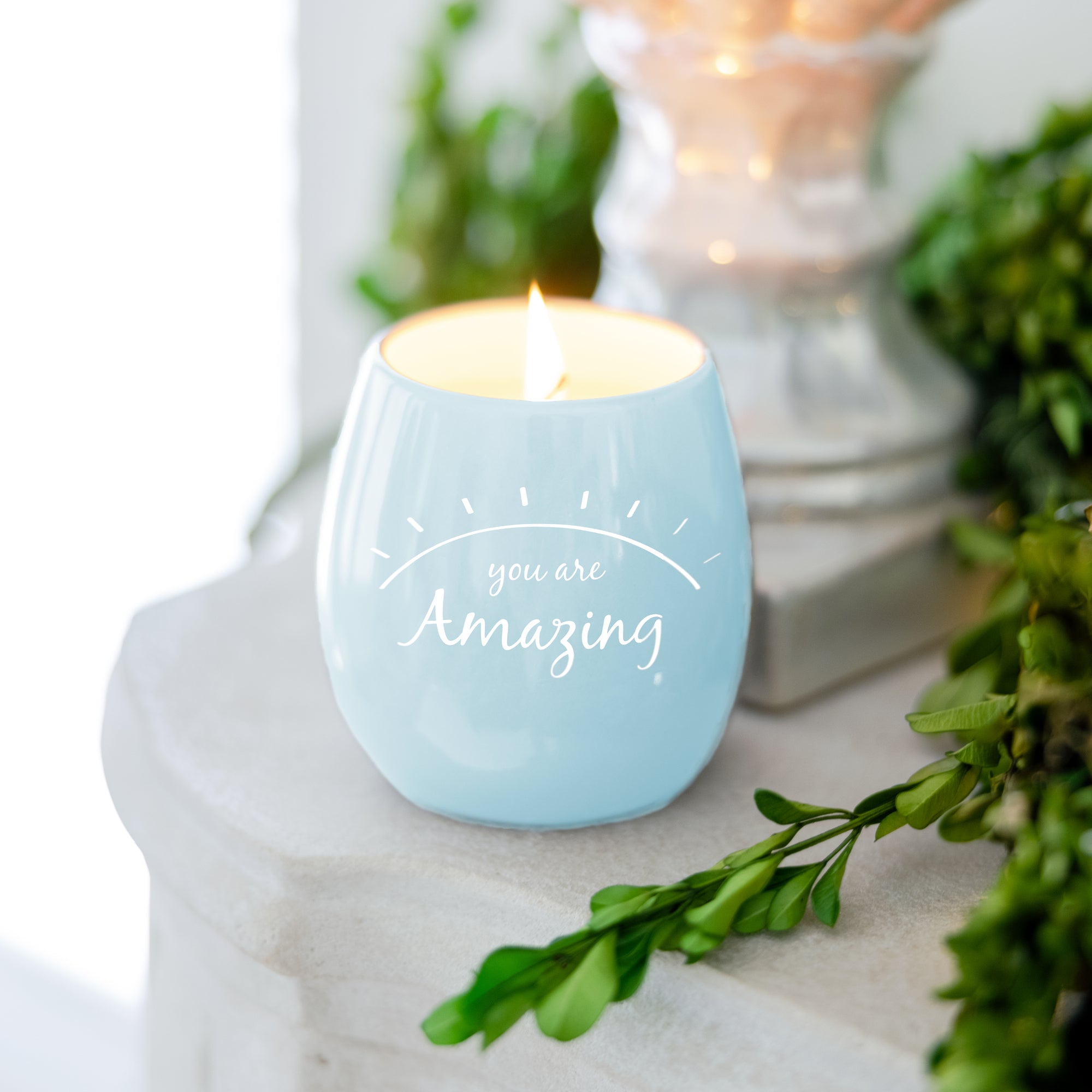 • IN-HOUSE DESIGN: The double-sided blanket has a debossed white embroidered "you are amazing" sentiment matched by a burst of sunshine on the blue plush side of the blanket. The aromatherapeutic candle has a white "you are amazing" sentiment and sunshine design. Socks have a gray ankle, heel, and toe accompanied by a heart and swirl design on a white sock base.