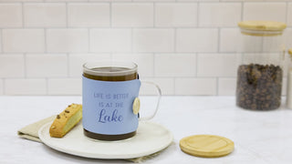 - IN-HOUSE DESIGN: Embrace the warmth of appreciation with this heartwarming drinkware adorned with a charming blue wrap. The wrap bears the loving sentiment "Life Is Better At The Lake," exquisitely engraved, complemented by delicate blue stitching, a tan button, and a white elastic closure for a touch of elegance. Meanwhile, the coaster cap crafted from natural wood grain showcases a rounded "Share Kindness" text encircled by a circular line, radiating positivity with every sip.