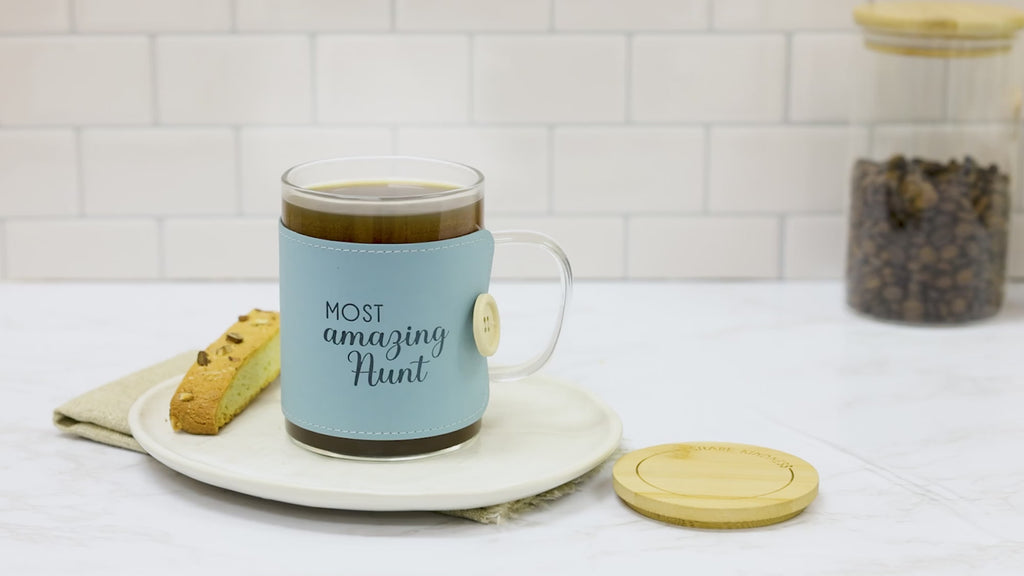 - IN-HOUSE DESIGN: Embrace the warmth of appreciation with this heartwarming drinkware adorned with a charming teal wrap. The wrap bears the loving sentiment "Most Amazing Aunt," exquisitely engraved, complemented by delicate teal stitching, a tan button, and a white elastic closure for a touch of elegance. Meanwhile, the coaster cap crafted from natural wood grain showcases a rounded "Share Kindness" text encircled by a circular line, radiating positivity with every sip.