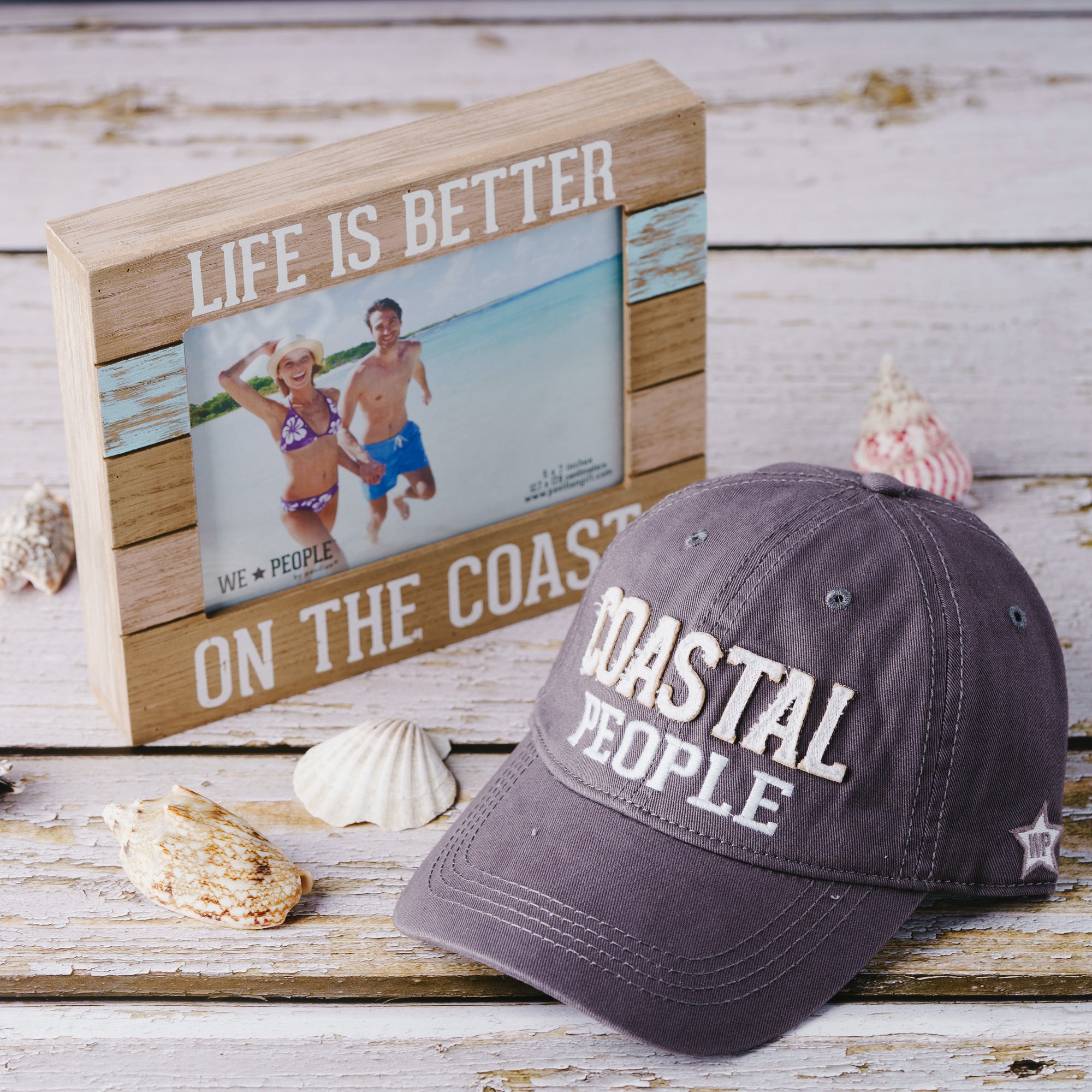 - IN-HOUSE DESIGN: Weathered light wood-washed shiplap look sturdy MDF construct with glass front. "Life Is Better On The Coast" white decal sentiment. The backing has four metal tabs for photo replacement. Self-standing or can be hung by the edge.
