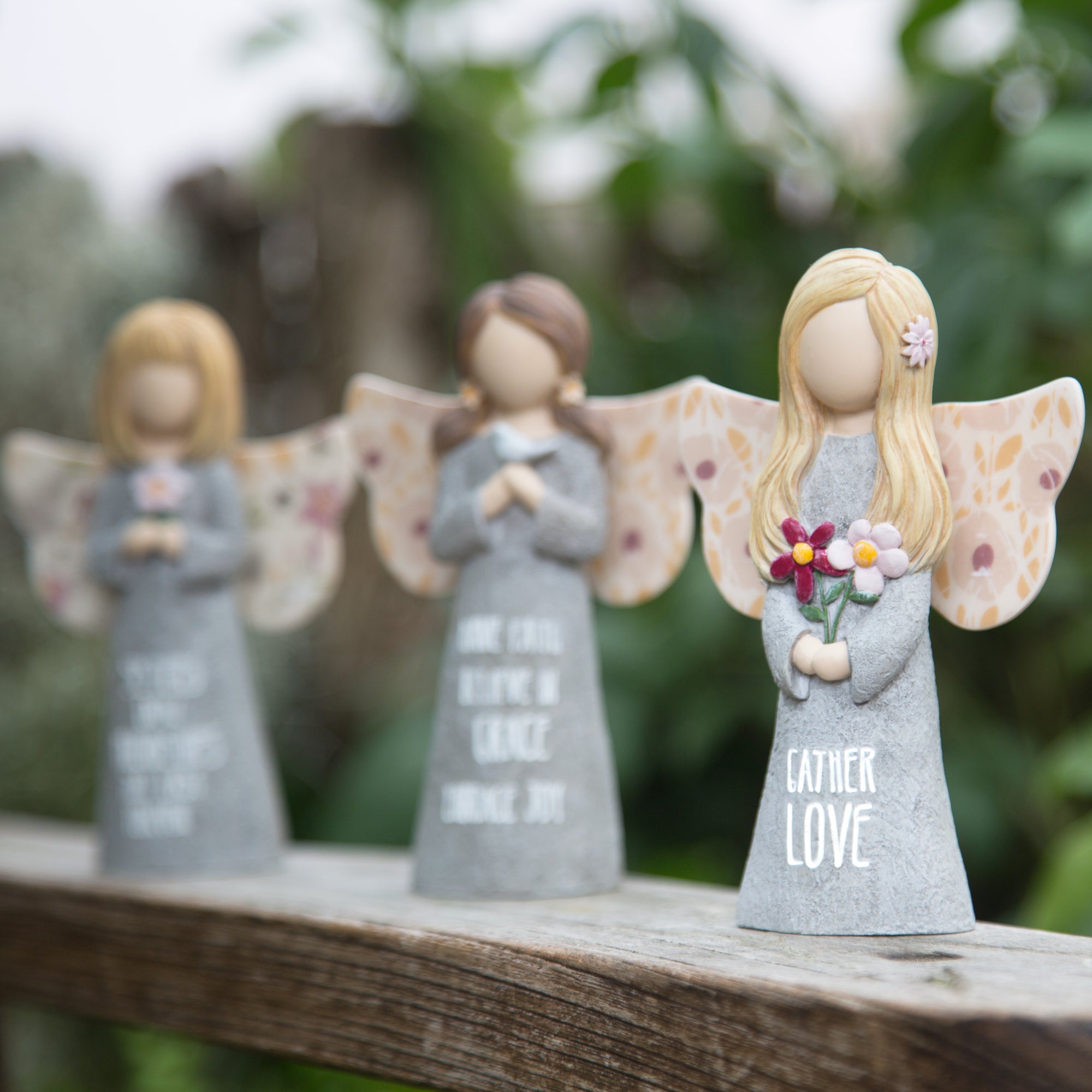 - IN-HOUSE DESIGN: Designed by Amylee Weeks, "Gather Love" text is debossed and painted onto the front of the angel, alongside an intricate floral design.