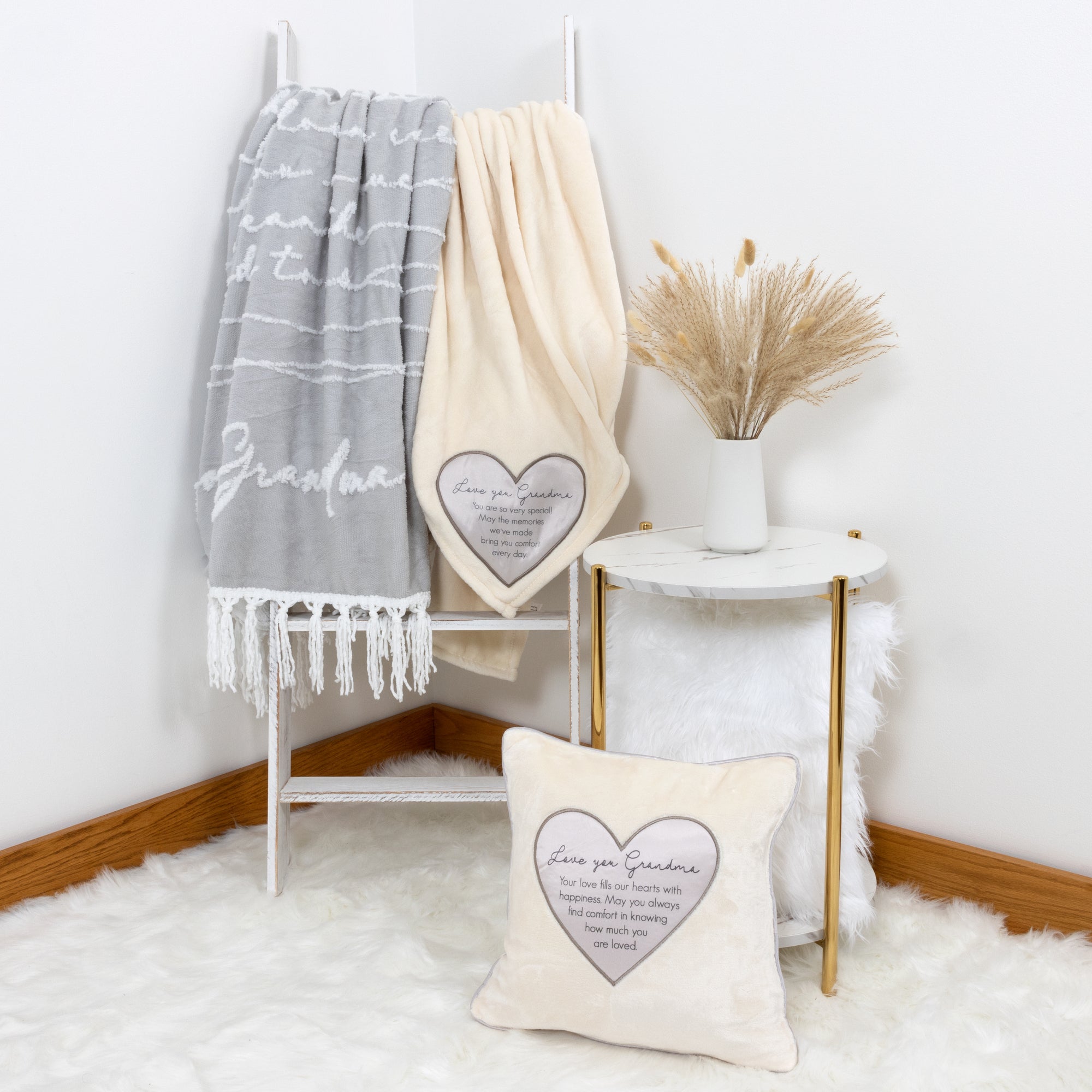 - IN-HOUSE DESIGN: Risen cursive sherpa "A Grandmother’s Heart Is An Endless Circle Of Love, Overflowing With Kindness Poured From Heaven Above. Whenever We Need You, We Know You Will Be There With Open Arms And Tender Loving Care. We Love You So Much, You Mean The World To Us. Love You Grandma" sentiment is conveyed by wave-like thread lines connecting the ends of the words to the edge of the blanket on beautiful soft gray background.