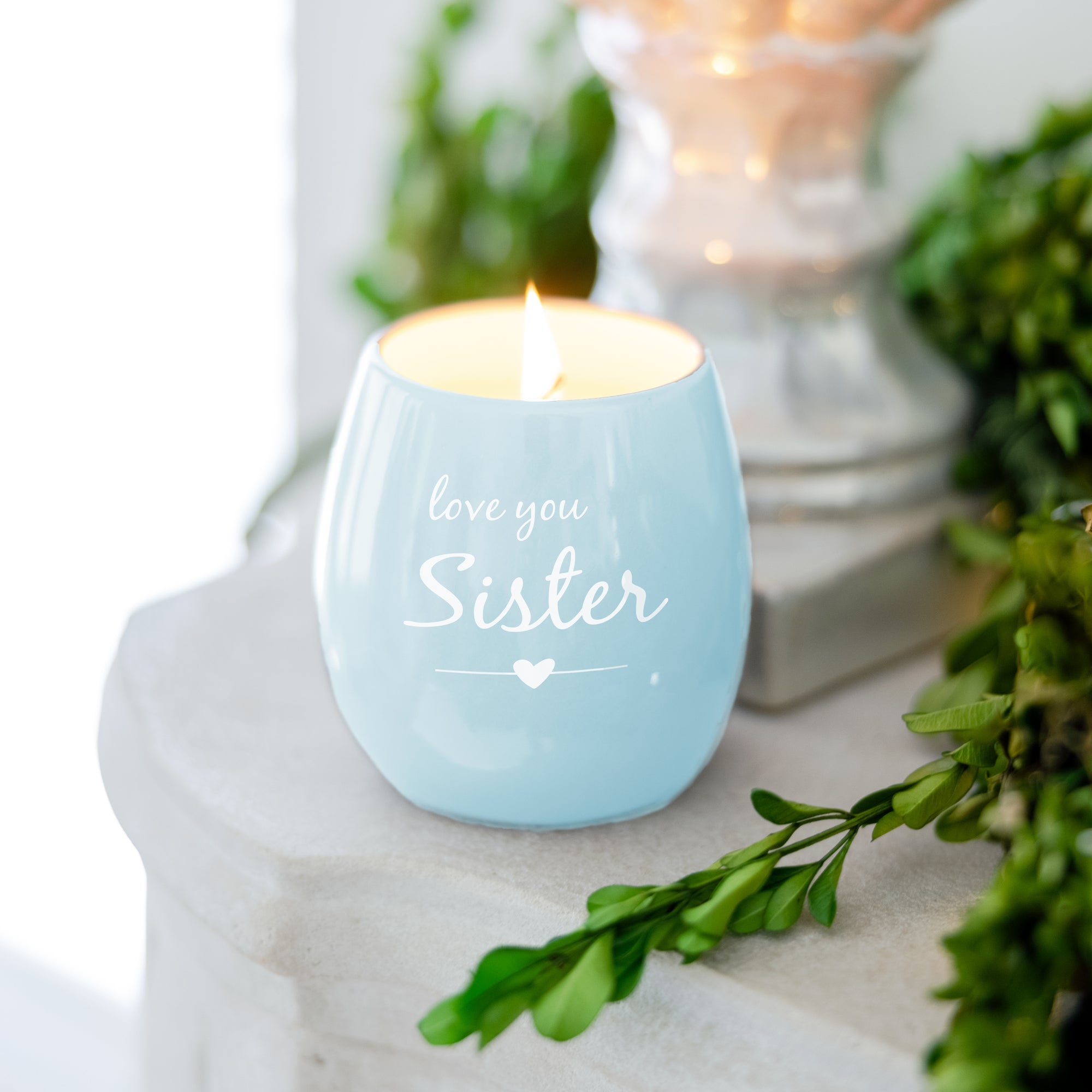 • IN-HOUSE DESIGN: The double-sided blanket has a debossed white embroidered "love you sister" sentiment matched by a heart pattern on the blue plush side of the blanket. The aromatherapeutic candle has a white "love you sister" sentiment and heart design. Socks have a gray ankle, heel, and toe accompanied by a heart and swirl design on a white sock base.