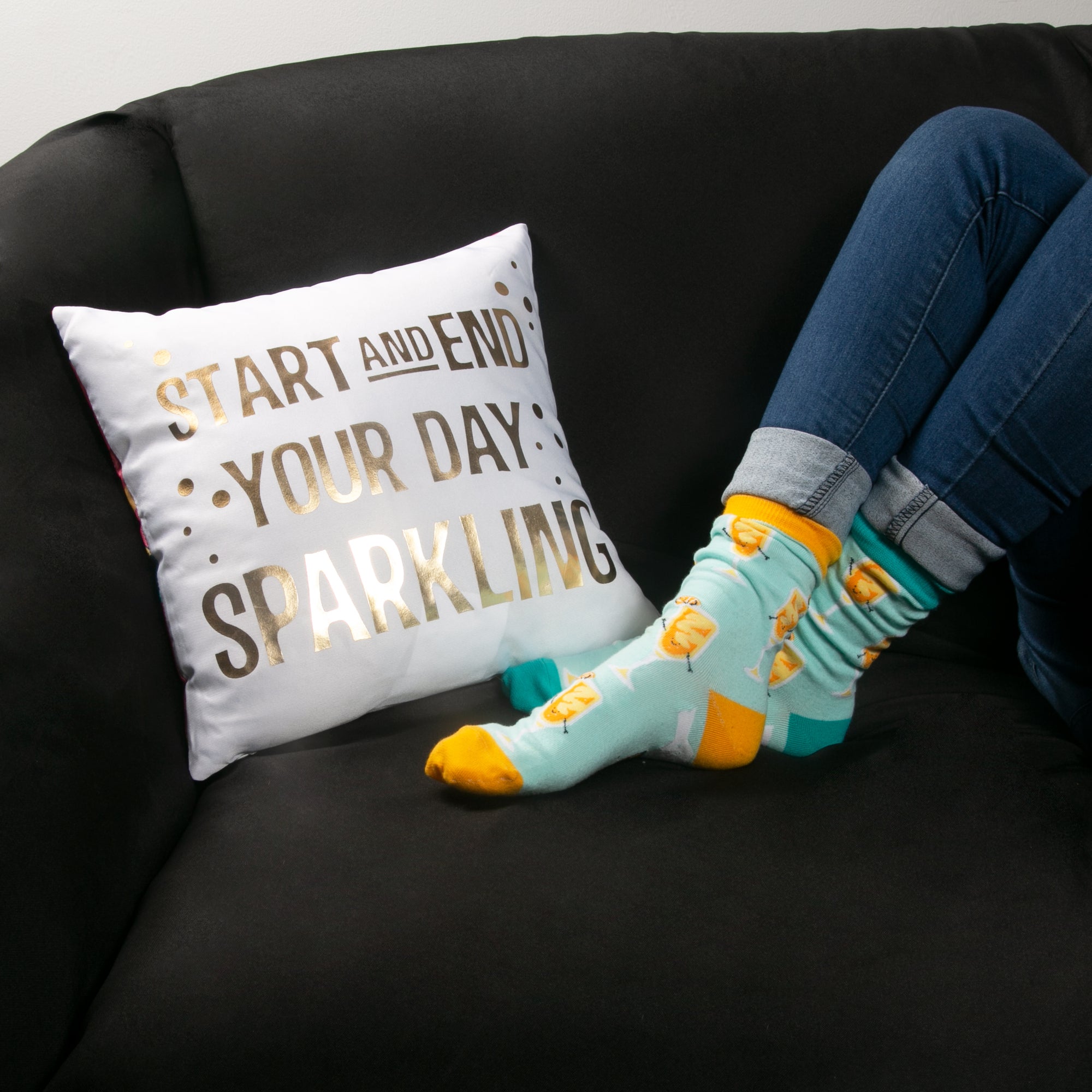 - IN-HOUSE DESIGN: "Start And End Your Day Sparkling" text is printed on the front, while the back features a champagne bottle, orange juice, and glass pattern.