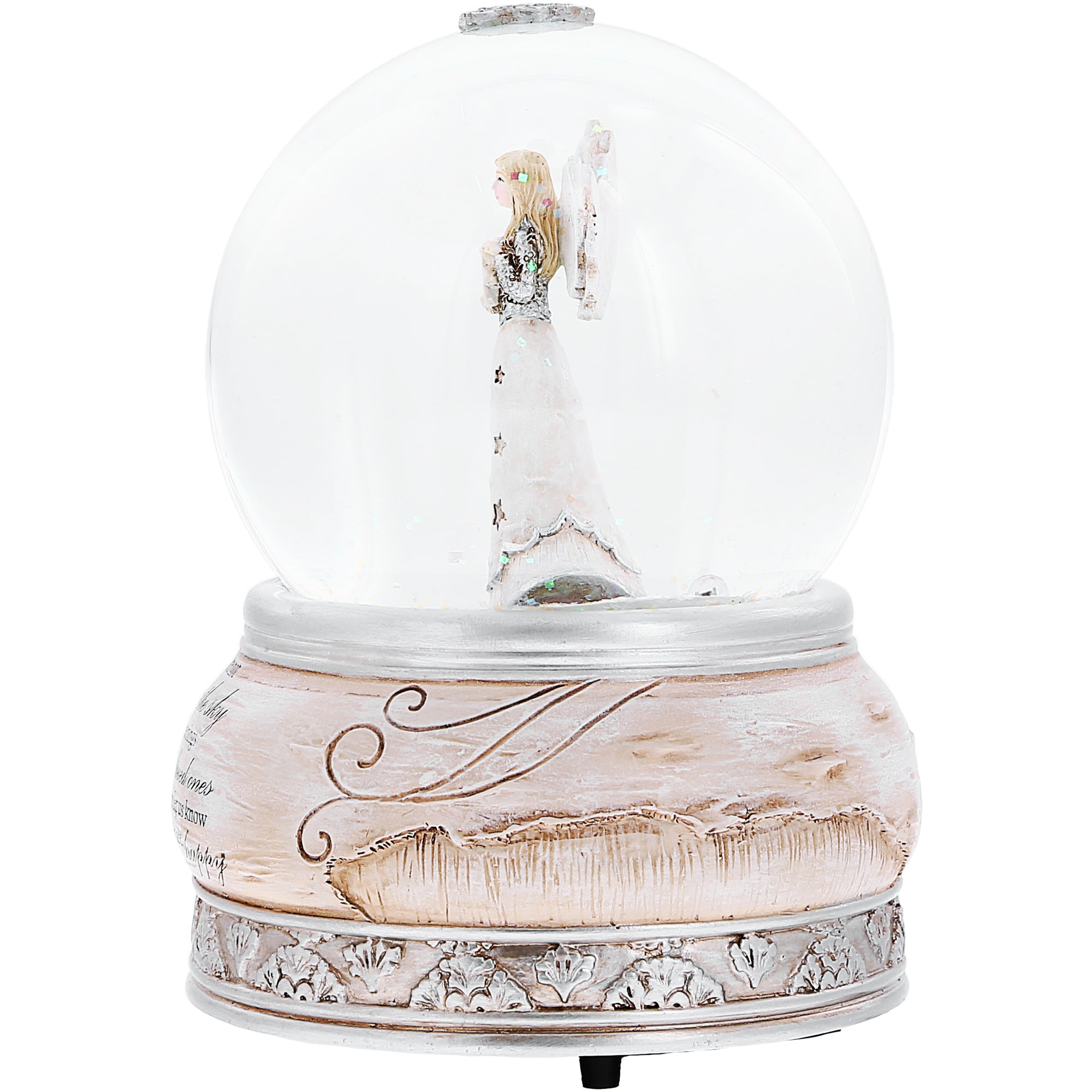 • PREMIUM QUALITY: A 5.75" tall x 4.25" long glass water globe is crafted with a resin bottom, top detail, and interior figurine detail. The glass globe contains purified water, iridescent glitter, an LED light, and an angel. The plastic bottom has a plastic switch for illuminating the bulb, plastic housing for the single AAA battery needed, not included, and a metal turn knob/interior metal musical component.